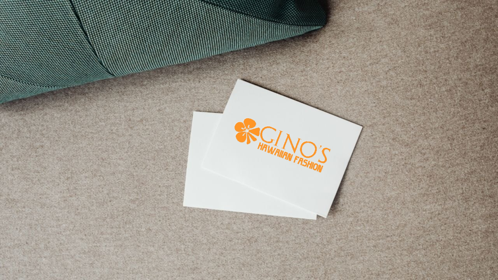 The flower-shaped logo spells 'GINOS', with the font growing more narrow at the inner circle of the logo. The colors are inspired by the island colors.